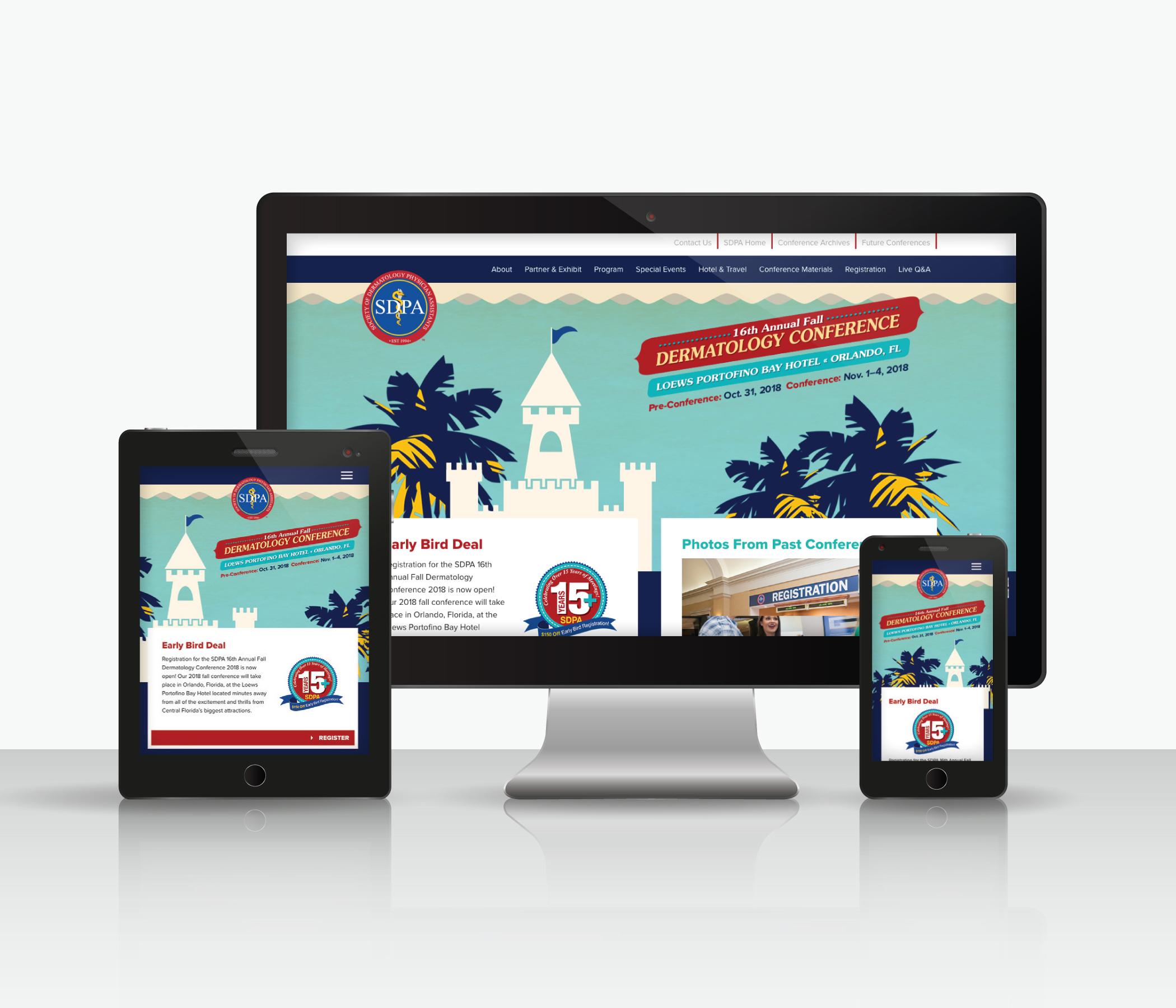 This conference template was designed for the Society of Dermatology Physician Assistants (SDPA). It’s repurposed every six months for their biannual conference. The template was designed to easily switch out the hero image and conference information for each event. The original design of the template incorporated SDPA branding and photos of the conference location. In recent versions, the conference brand was applied. I was responsible for the design and build of the original template. I have also updated the template with the latest conference branding. The site’s content is curated by the client.