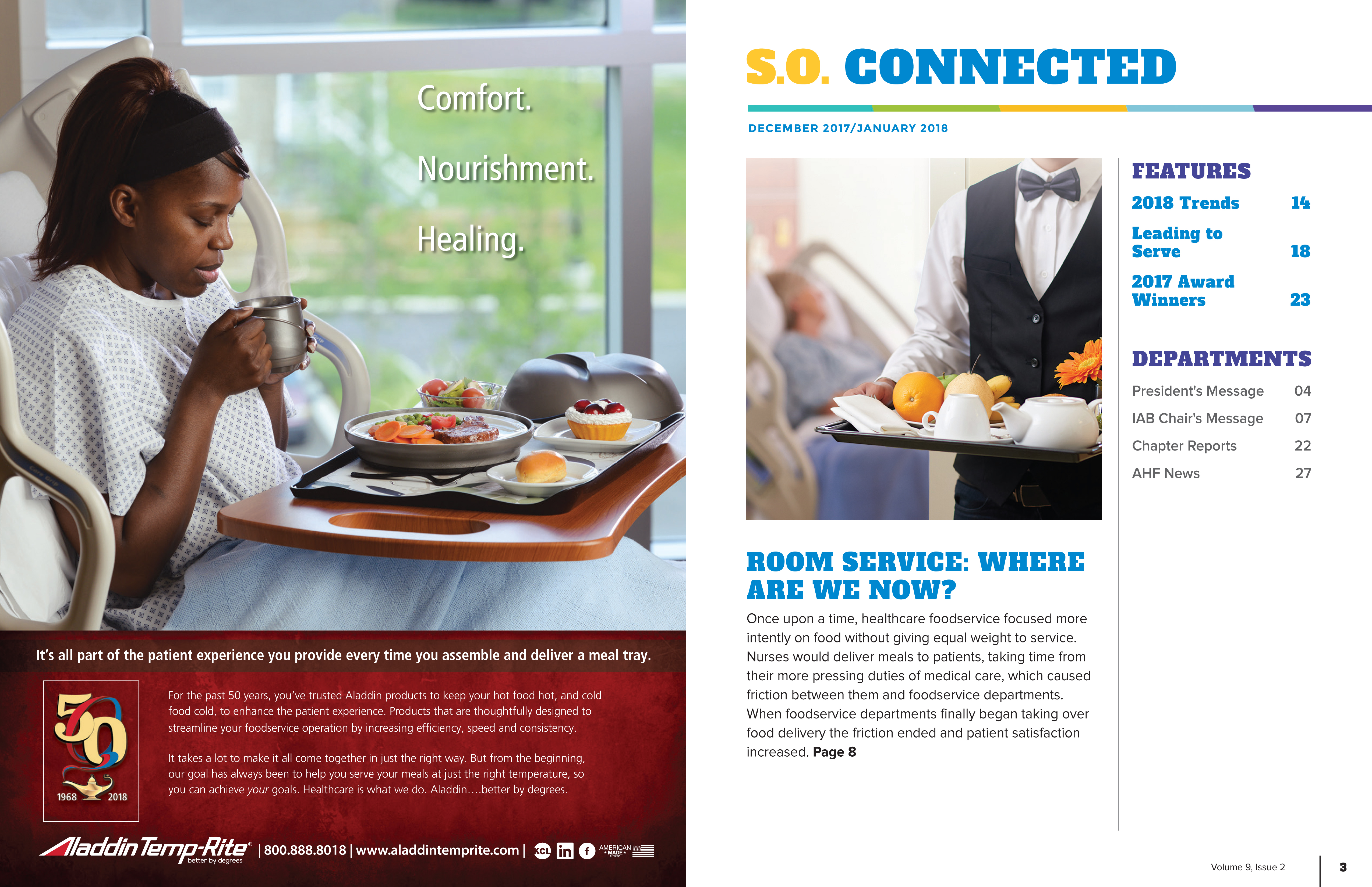 Association for Healthcare Foodservice (AHF) runs the quarterly S.O. Connected magazine. I used an existing template that my former colleague, Derek Heilmann, designed to layout the cover and article pages for each new issue.